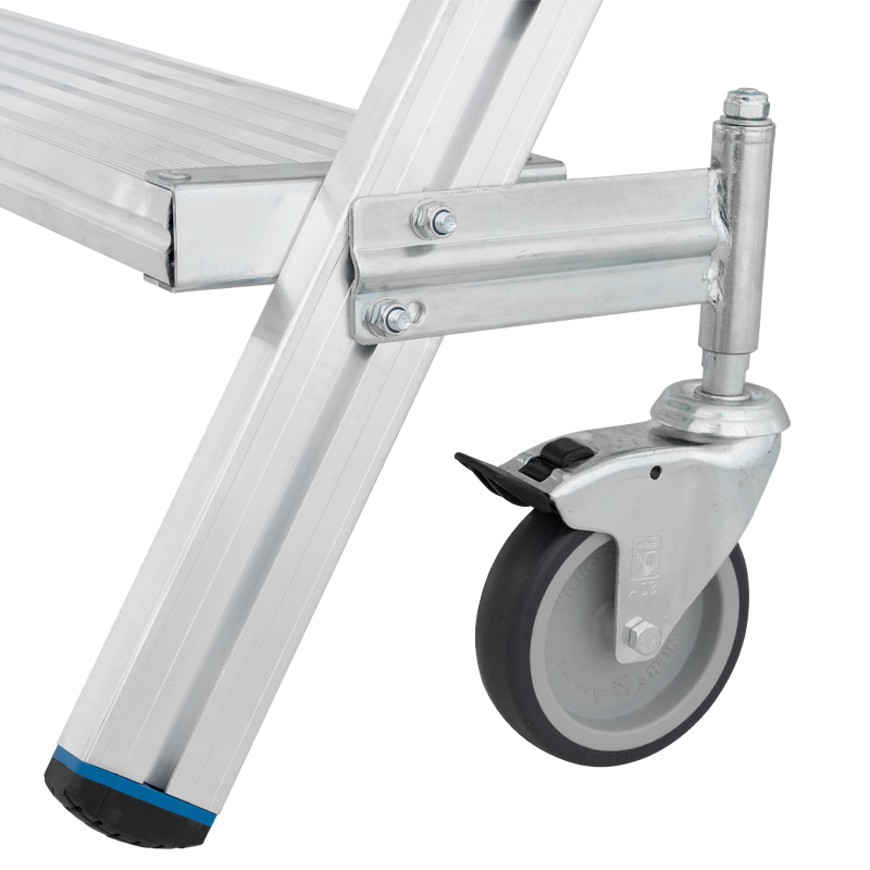 Scara cu platforma mobila din aluminiu, acces pe o singura fata, cu trepte anti-alunecare de 175 mm adancime si platforma mare cu balustrada de platforma pe toata lungimea pentru lucru sigur si confortabil
